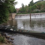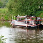 Beim Stopp am Anleger in der Nähe der Naumburger Henne wechselten wir erneut die Steuerfrau. Mit Anke als Leichtgewicht auf dem Sitz ging es in Richtung der Unstrut-Mündung. Auf der Unstrut ist der Wasserweg natürlich enger und die Strömung ist stärker. Tapfer ruderten wir die 5 km und waren echt froh, als Freyburg in Sichtweite kam. Stolze 23 km hatten wir zur Hälfte der Strecke zurückgelegt. Unterhalb des Freyburger Wehres fanden wir einen Liegeplatz. Wir staunten nicht schlecht, denn dort lagen bereits 2 Vierer, die wir dem Naumburger Ruderverein zuordnen konnten. Frank Democh begrüßte uns am Ufer und half beim Anlegen unserer „Müritz“. Genau wie wir nutzten die Naumburger den Feiertag für eine Rudertour. Wir gönnten uns in Freyburg direkt an der Unstrut in einem gemütlichen Lokal das verdiente Mittagessen und eine Pause. Gut gestärkt und mit aufgeladenem Akku ging es mit Silvia am Steuer nun stromab die Unstrut hinunter in Richtung Blütengrund. Das war das Schöne an der Rückfahrt. Die Strömung erleichterte die Ruderarbeit doch ungemein für uns. Nicht schlecht staunten wir über Ruderfreund Mike Sachse, der mit der Kamera im Anschlag auf der Henne-Brücke auf uns lauerte. Wir versuchten mit sauberer Rudertechnik vor ihm zu glänzen. Beim Naumburger Ruderverein machten wir am Bootssteg halt. Wenige Meter entfernt in der Wirtschaft „Zum Pegel“ gab es Kaffee und Eis zur Stärkung. Langsam drängte dann doch etwas die Zeit, denn die Oeblitzschleuse mussten wir bis 18 Uhr passiert haben. Das gelang uns problemlos.
