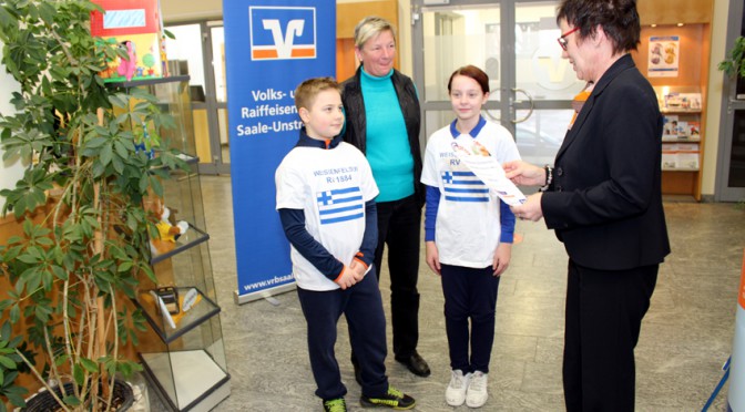 Ben Baust (AK10) und Julie Staritz (AK12) übernahmen aus den Händen des Vorstandes Beate Lyga von der Volks- und Raiffeisenbank Saale- Unstrut eG strahlend einen Scheck in Höhe von 2000,00 €. Schon auf der Fahrt in die Bankfiliale in Weißenfels in der L.-Kell-Straße waren beide Sportler sehr aufgeregt, wie hoch die Fördersumme ausfallen würde und sie machten sich Gedanken, was man kaufen könnte. Beim Erhalt des Schecks über 2000,00 € erklärten sie spontan allen Gästen und Mitarbeitern der Geschäftsstelle Weißenfels, es sollte ein Kindereiner angeschafft werden. Der WRV bedankt sich bei der Volks- und Raiffeisenbank Saale Unstrut eG sehr herzlich für diese finanzielle Zuwendung.